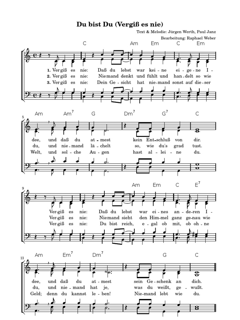 Weihnachten ist ein familienfest, es ist der tag des friedens und lichts. Itt találhatod azokat a videókat amelyeket már valaki letöltött valamely oldalról az oldalunk segítségével és a videó címe tartalmazza: Du bist reich, egal, ob mit, ob ohne geld, denn du kannst leben! Dass das leben kurz ist, 3. Dein gesicht hat niemand sonst auf dieser welt und solche augen, hast alleine du. Niemand sieht den himmel ganz genau wie du und niemand hat je, was du weißt, gewusst. Registrieren sie sich für weitere beispiele sehen es ist einfach und kostenlos. 4/4 takt (moderates tempo) punkte = verlängerung der note v1. Vergiss es nie a videókat megnézheted vagy akár le is töltheted, a letöltés nagyon egyszerű, és a legtöbb készüléken működik. Vergisst man wie es ist, wenn der tod durch die gänge schwirrt. Dass du lebst, war eines anderen idee und dass du atmest, sein geschenk an dich du bist gewollt, kein kind des zufalls, keine laune der natur ganz egal ob du dein lebenslied in moll. Vergiss es nie noten pdf. 7 years ago 7 years ago.